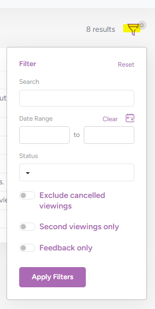This page lists all viewings across your property portfolio, including feedback. The list can be filtered at the top of the page: