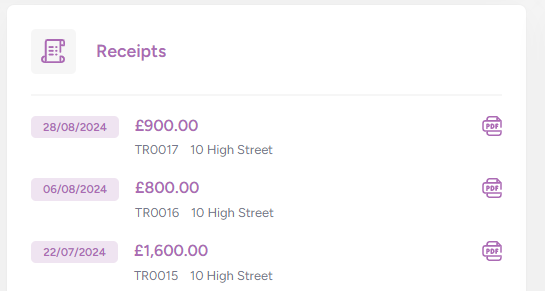This widget provides a list of the most recent payments that you have made. Clicking on the amount shows what the payment has been allocated to (e.g. which rent period), and clicking on the PDF icon allows you to download a copy of the receipt: