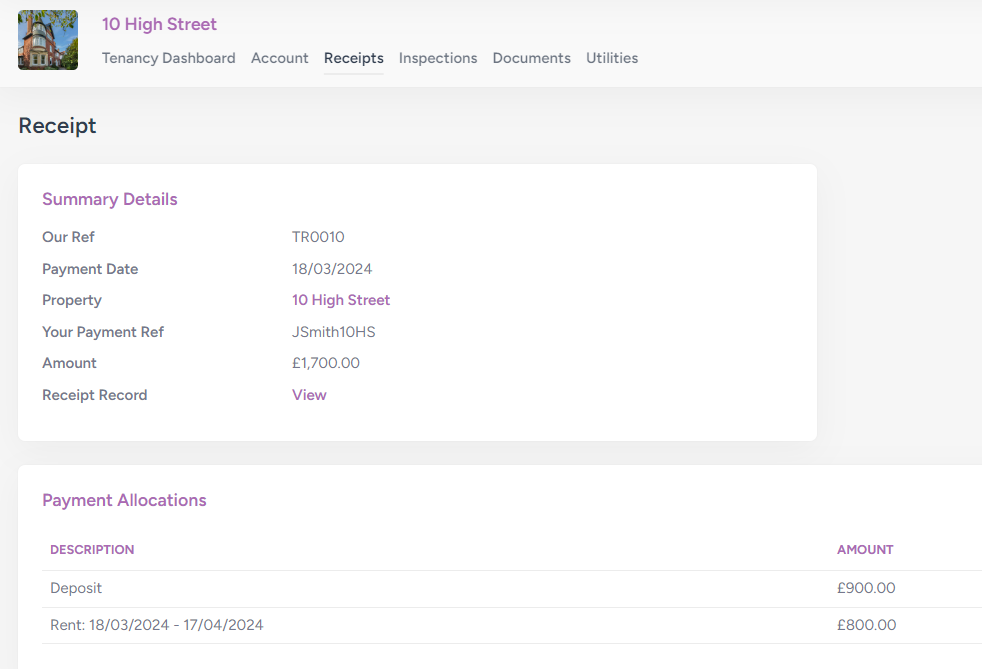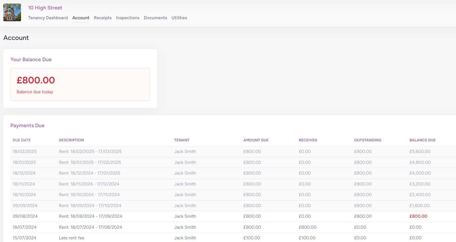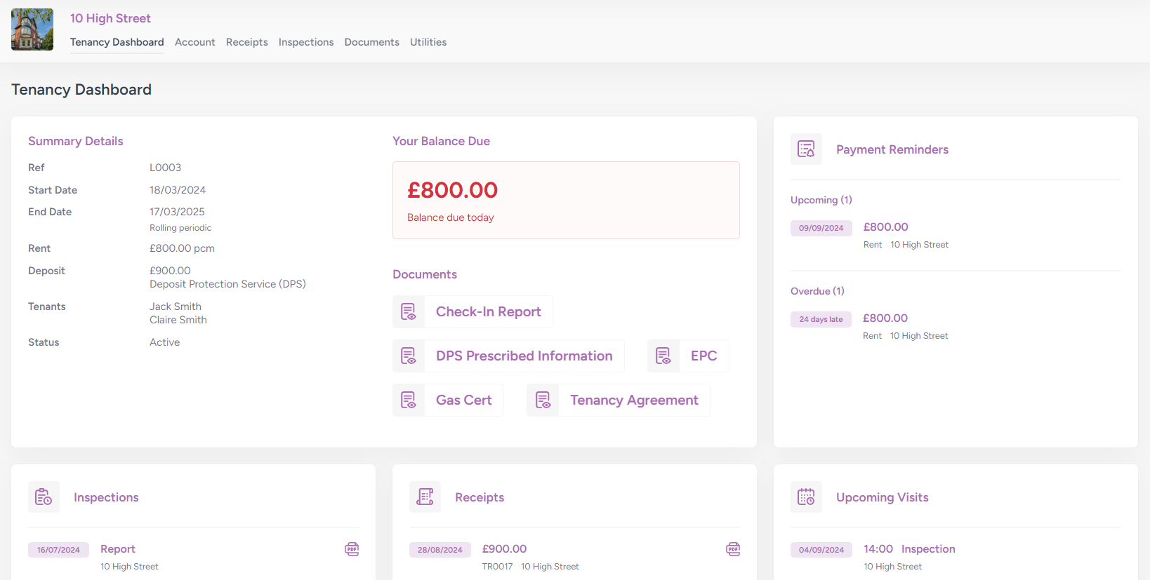 This page lists all of your tenancies with the agent. Clicking onto a tenancy takes you to a dashboard page for the tenancy: