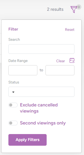 This lists all of the viewings you have booked in, and past viewings, with a filter in the top right-hand corner: