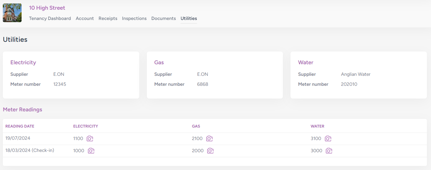 This page provides details of the utilities providers and meters, plus a meter reading history from check-in: