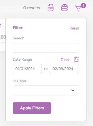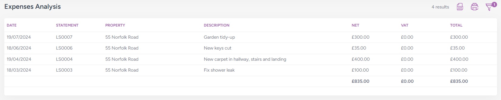 Click "Apply Filters" to run the report, which shows a description of each expense, when it was incurred, and the amount with a VAT breakdown. The report can then be downloaded into a spreadsheet or printed: