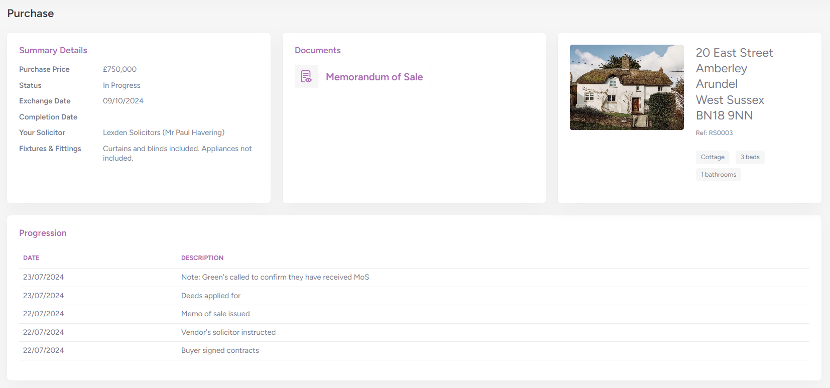 Click through to the purchase from your dashboard page (or the "Purchases" menu). This will display details of your purchase, documents relating to the purchase (e.g. memo of sale), plus the full progression: