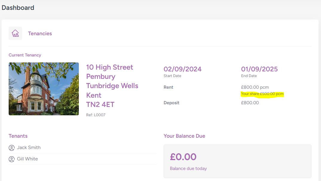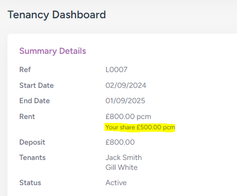 If you are part of a multi-tenant letting, splitting the rent across the other tenants, you can see your share under the contractual rent on your dashboard page: