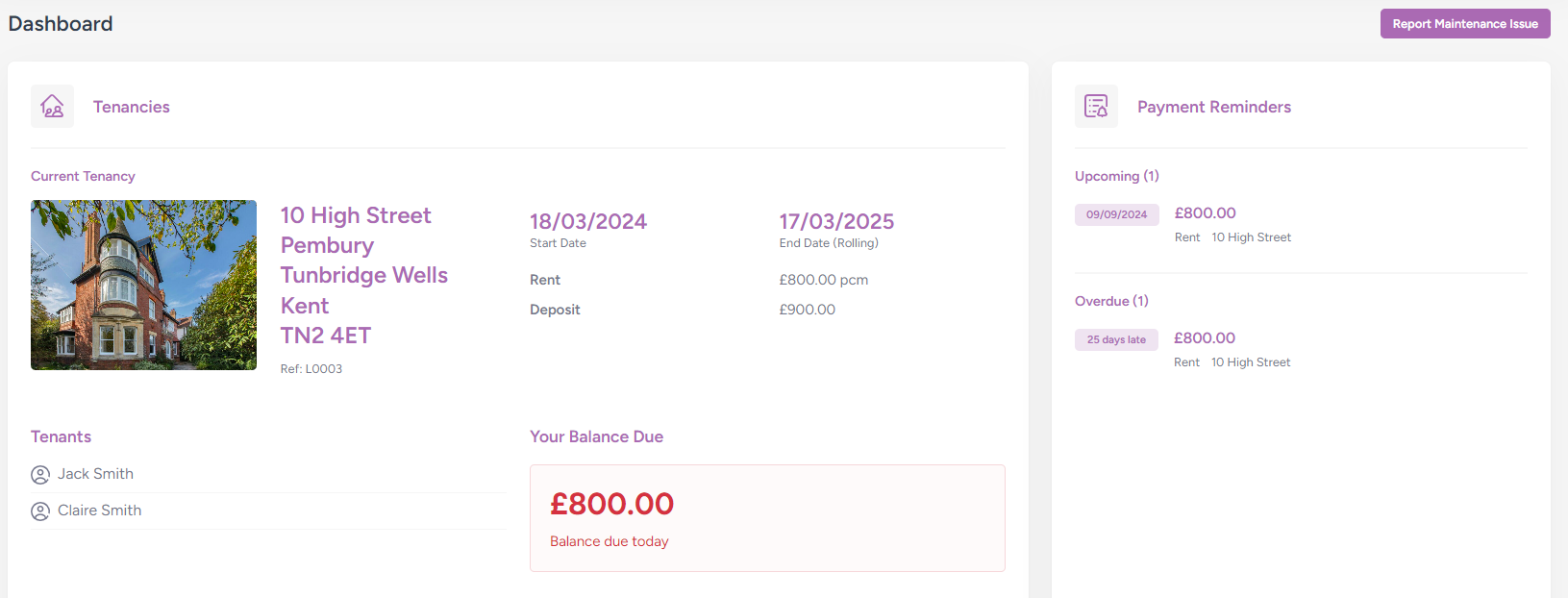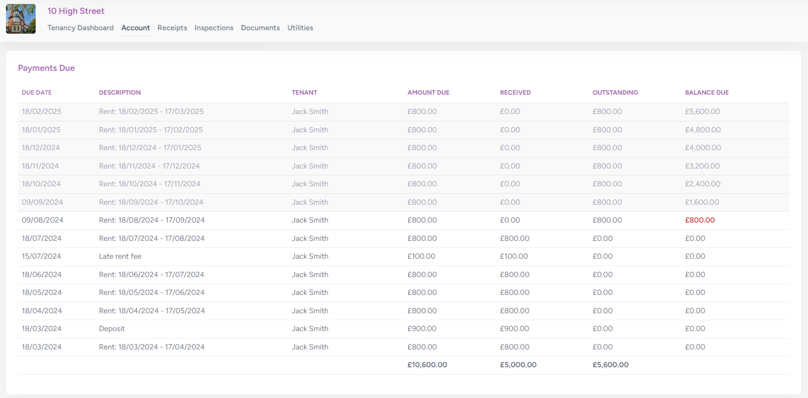 To view your tenancy account, just click on the balance due figure on your dashboard page (or the "Account" menu on your tenancy page):